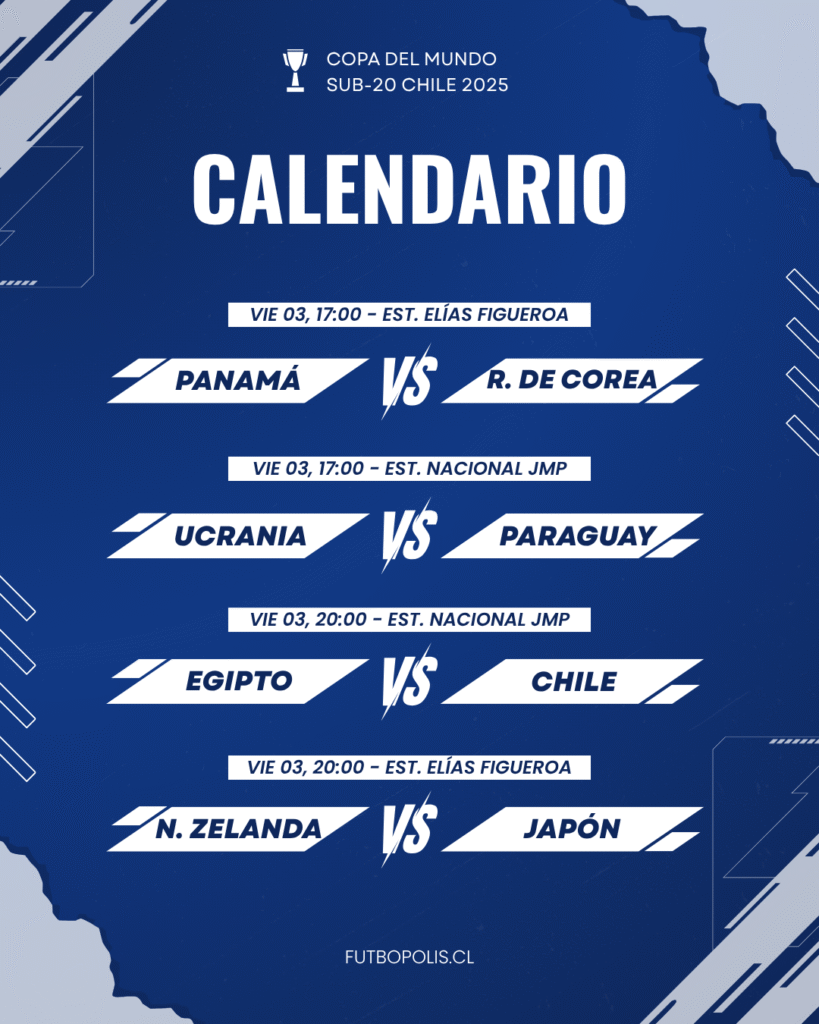 Este viernes es día de certezas en el Mundial Sub-20 Chile 2025, dado que se inicia la fecha 3 de partidos, la última jornada, para los Grupos A y B de la competencia. Todo inicia a las 17:00 en Valparaíso y Santiago, en el caso del Estadio Elías Figueroa serán los seleccionados de Panamá y República de Corea los que se enfrenten. Por su parte, en el Estadio Nacional, Ucrania y Paraguay definen su destino en la cita mundialista.